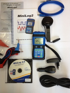 Прибор Minilog 2 с электрическим реле, USB-кабель, зарядное устройство 230B, зарядное устройство 12B, калибровочный сертификат, программное обеспечение.