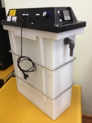 Комплект включает: 1 бачок из PVC c защитой внутри из прочной нержавеющей стали, 1 собирающий корпус (катод), 2 угольных пластины (анод), 1 набор для подключения, крышка со всей встроенной электрической частью.